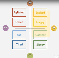 Hanke käytti sovelluksen pohjalla nelikenttää, jonka kaksi akselia ovat ilo-suru ja energisoitunut-väsynyt (kuva 1). Sovelluksen avulla näkee helposti yhdellä vilkaisulla mihin sektoreihin osallistujat sijoittuvat.