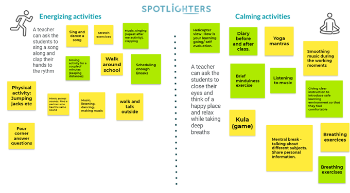 Askel kaksi koulutuksessa oli reagoida ilmapiiriin. Tarvitseeko luokka energisoivaa vai rauhoittavaa harjoitusta? Laadimme koulutuksen aikana kuvassa 2 näkyviä ideoita näihin tilanteisiin.