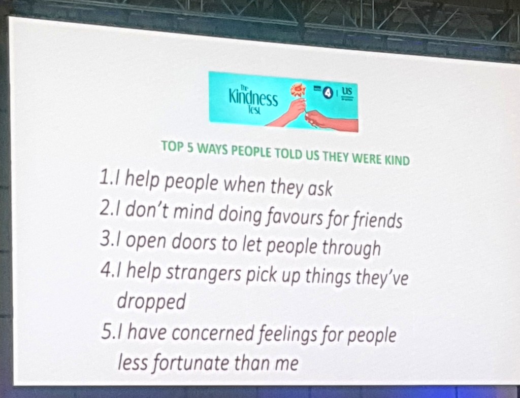 Claudia Hammond Sussexin yliopistosta oli yksi pääsalin puhujista otsikolla Kindness and Public Engagement. Hammond ryhmineen on kerännyt massatietoa siitä, miten osapuolet kokevat ystävällisyyden ( niin sen antamisen kuin saamisen) ja toisaalta tietoa siitä, miten eri asiat vaikuttavat siihen. Yhteen isoon massatutkimukseen osallistui 60 000 osallistujaa! Alla olevasta kuvasta näkyy, miten ihmiset kuvasivat omaa ystävällisyyttään.