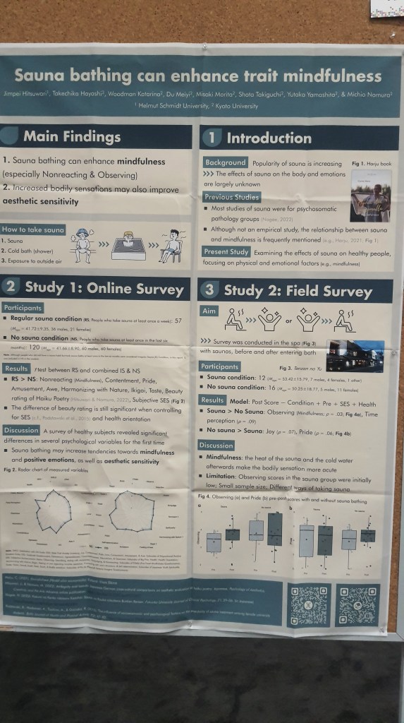 Vaihtoehtoja ohjelmassa oli liikaakin ja ohjelmaa selatessa hämmästytti ja välillä melkein naurattikin, mitä kaikkea voikaan tutkia. Sympaattisin oli ehdottomasti nuori japanilainen mies, joka oli tutkinut saunomisen ja mindfulnessin yhteyksiä. Ihastui kovasti, kun kerroin olevani Suomesta. Alla olevasta kuvasta voi tutustua tutkimukseen.
